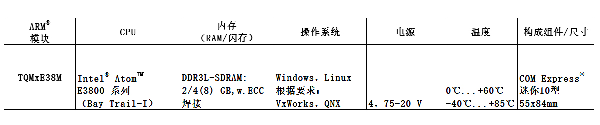 TQ模块TQMxE38M支持强大且经济的x86系统,后者是基于国际建立PICMG®标准COM Express®Mini (COM.0 R2.1)的。在10型兼容引脚排列中,用户可以访问CPU的所有基本接口。所以,用户也就可以使用Intel®Atom™处理器的所有功能。直接访问诸如数字显示端口(DDI)/嵌入式显示端口(eDP)和USB设备接口让用户能够以其应用程序最合适的方式和最大的自由度来使用CPU功能。紧凑且坚固的设计以及可选保形涂层让该模块适用于恶劣的工业、铁路与航空等环境应用。基于极低功耗和扩展温度支持,它还可以以简单可靠方式实现户外应用。
