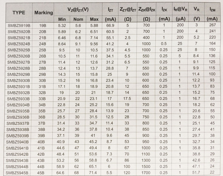 SMAZ5919B~SMAZ5945B稳压二极管参数: